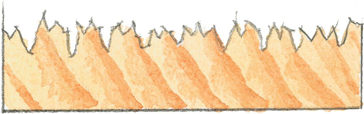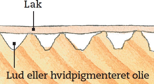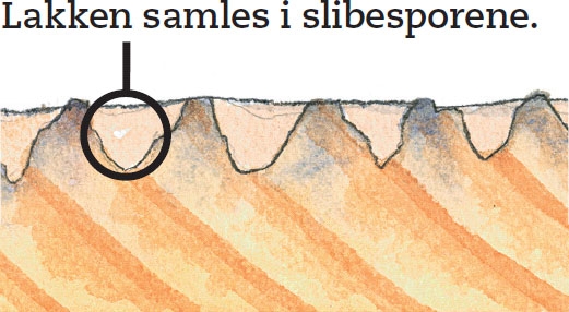 Det kræver derfor langt mere olie eller lak at lukke et gulv med slibespor, og stadig vil toppene mellem sporene kun blive dækket af et meget tyndt lag. Og så hjælper det ikke, at du har smidt nok så meget lak eller olie på gulvet. Når træet på toppene får fugt og ødelægges, skal hele gulvet slibes. Og lud eller hvid lak og olie vil ikke skjule, men fremhæve slibesporene.