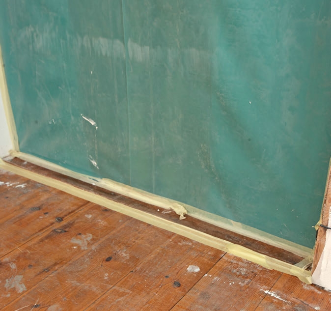 Luk grundigt af mod husets øvrige rum. Døre slutter slet ikke tæt nok til at hindre, at støvet finder ud i huset og trænger ind overalt, helt ned i skabe og skuff er. Her bruger vi dampspærreplast, som tapes fast.