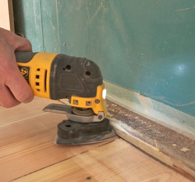 Vi begynder med at slibe kanten hele rummet rundt ned til rent træ med korn 24 på vores kantsliber. Det meste tager vi ved at trække sliberen langs væggen, men de yderste centimeter fanger vi kun ved at holde maskinen vinkelret på væggen.