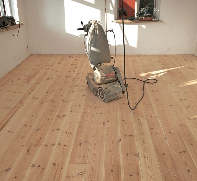 Vi har fjernet lakken og de små skader i træet, og gulvet er nu jævnt, rent - og dækket af slibespor, som ville gøre gulvet umuligt at holde, hvis de fik lov at stå. Gulvet ville suge vand og skidt til sig, og ethvert forsøg på at lakere eller oliere er spild af penge og gør ondt værre.
