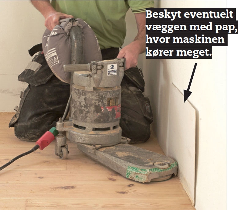 Vi starter med korn 60 på den store maskine og lader nu kanterne stå, til vi når til sidste finhed. Systematisk skubber og trækker vi, vender maskinen for at nå begge vægge - kører hele gulvet over igen og igen, til korn 60 ikke gør det glattere.