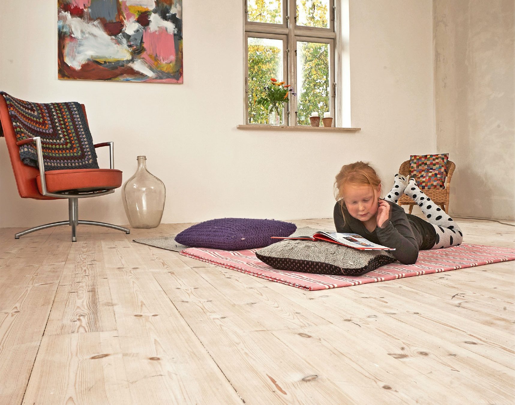 Gulvet er nu slebet, så det er helt perfekt: jævnt, rent og glat som silke. Men det skal beskyttes, ellers vil det alt for hurtigt få ridser, få trådt sand og skidt ned i træet og få fugtskader.