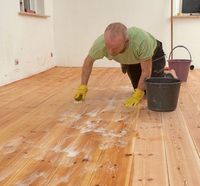 Gulvet vaskes. For at få det bedste resultat med efterbehandlingen skurer vi gulvet med et grundrensemiddel og vasker det med rent vand. Men så skal det have lov at tørre mindst et døgns tid, inden vi behandler det.