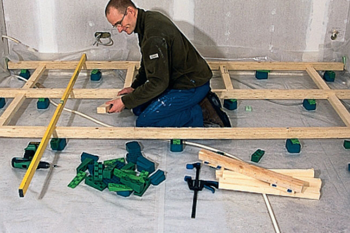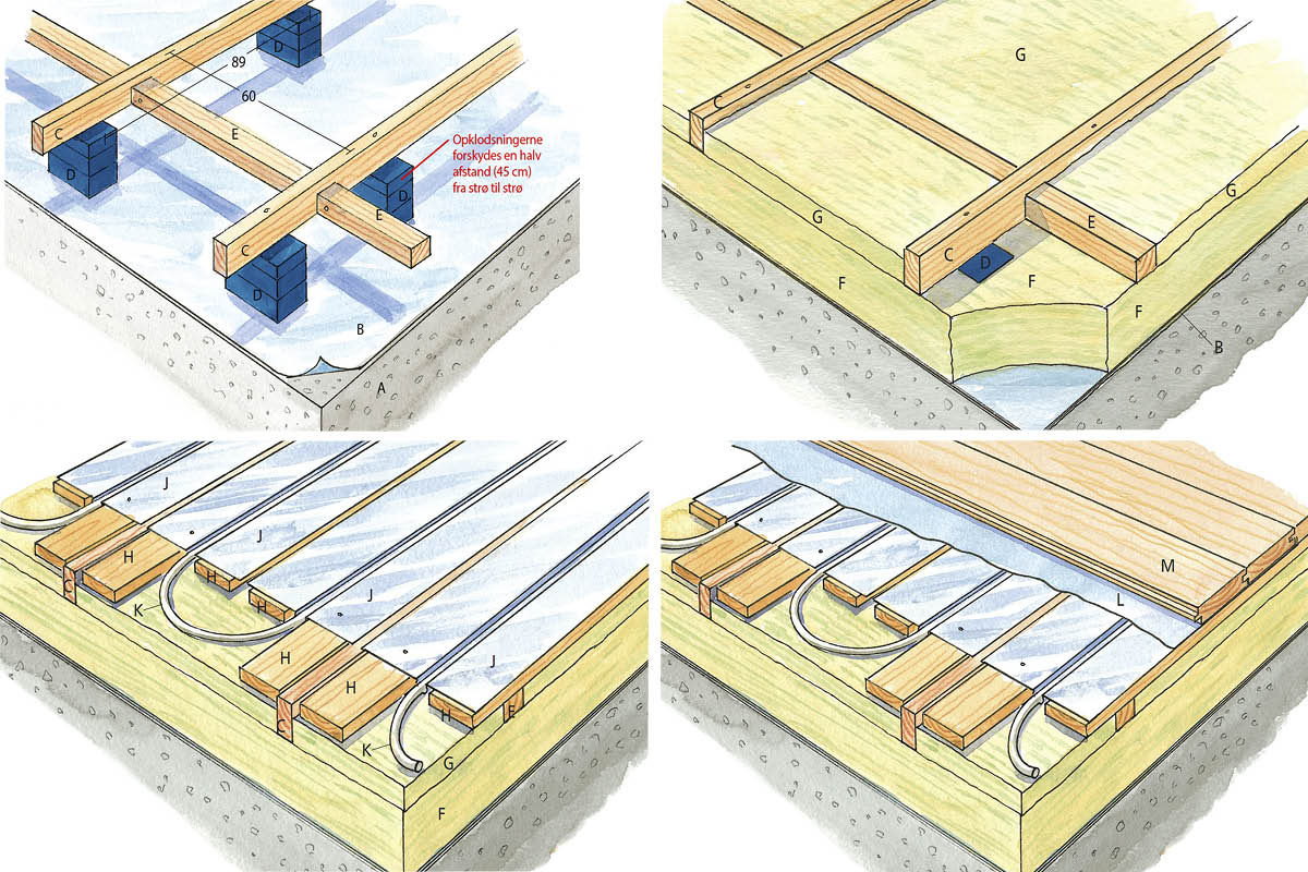 Her er lægningen af gulvet i fuld gang. Bemærk, at opklodsningerne (D) forskydes en halv afstand fra strø til strø. På den måde bliver underlaget for gulvet mere stabilt.