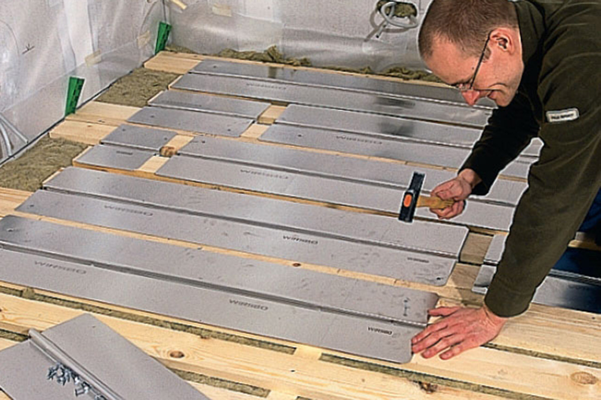 Bred varmefordelingspladerne (J) ud over gulvet. Den ene flange, som vender mod strøen, gøres fast til brædderne med søm. Rillen i pladen placeres midt i revnen mellem brædderne.