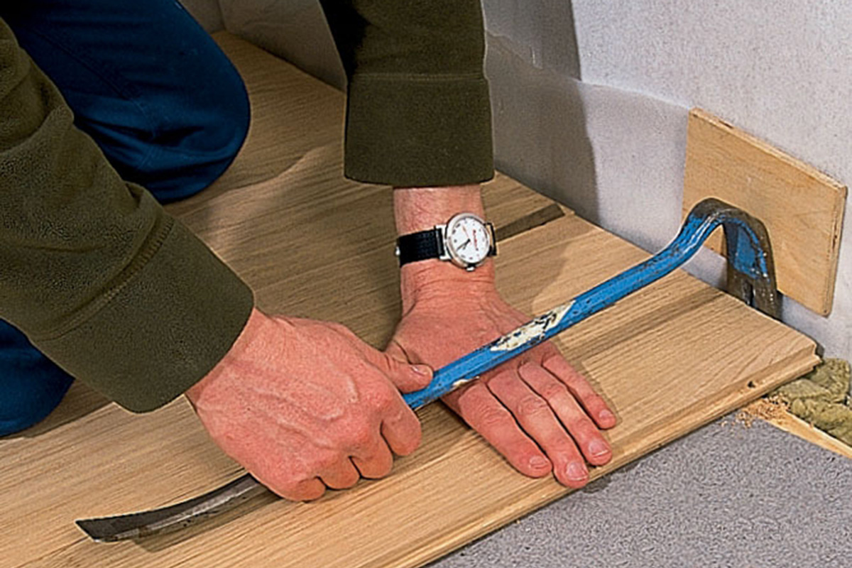 Første række skal være helt lige og uden flyverstød. Det er en god idé at spænde en snor ud, så du kan måle ud til rækken med et stykke gulvbræt. Gør derefter brættet fast ca. 2 cm fra kanten. Du kan anvende dykkere, som du undersænker og spartler ud med plastisk træ.