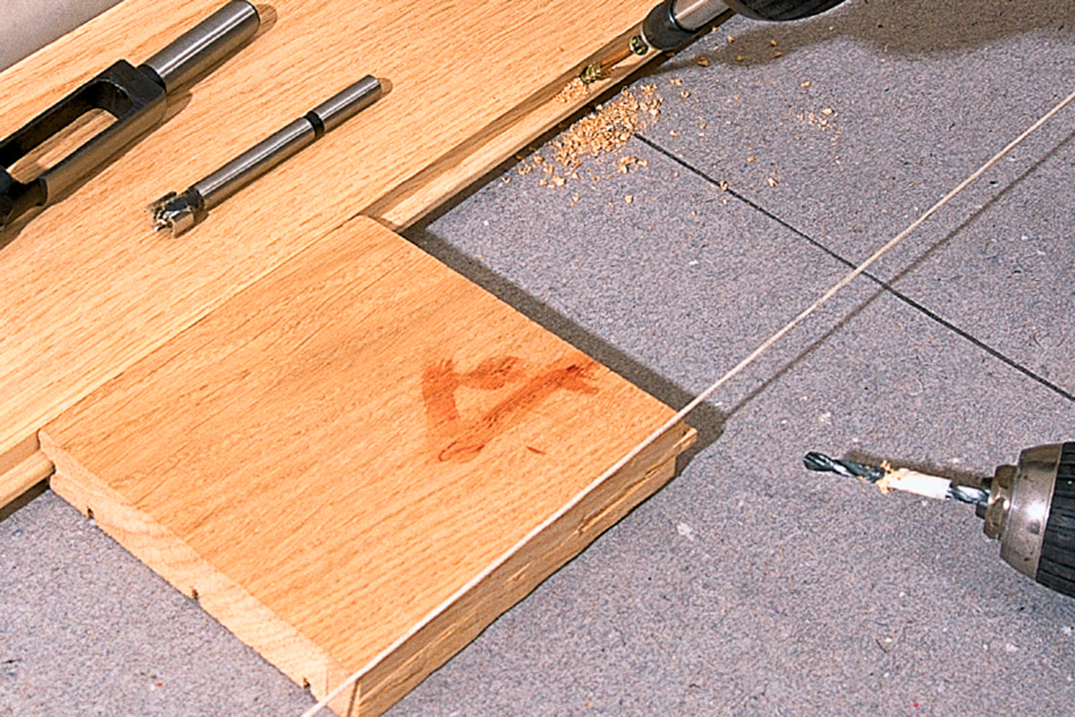 Når brættet skal fastgøres, bores et hul i feren i 45-60˚ vinkel, hvorefter brættet skrues fast (4,2 x 55 mm skrue). De yderste huller dækkes med en træprop (laves med et propbor) – de øvrige skruer bliver skjult.