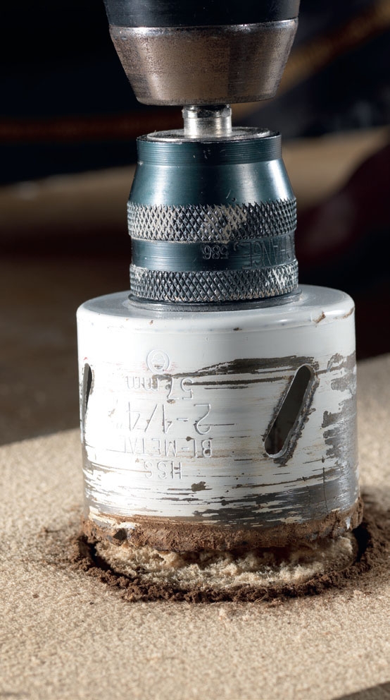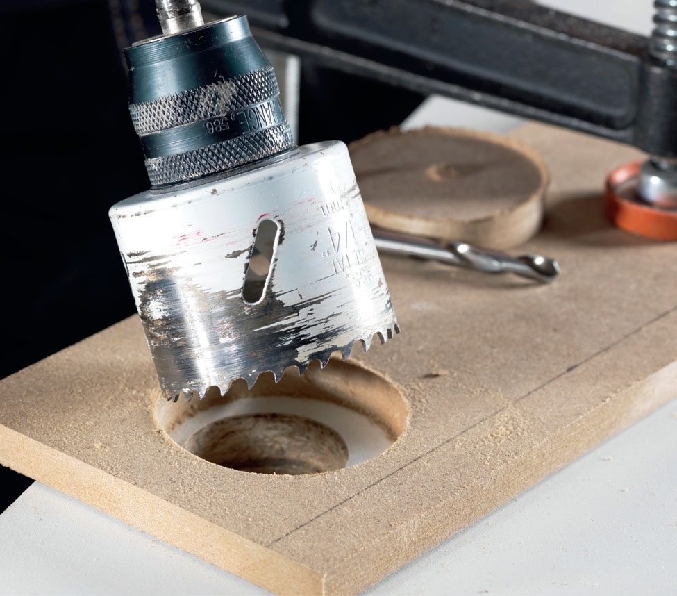 Centerboret i hulsaven sørger normalt for at holde saven der, hvor hullet skal være. Men er der et hul i forvejen, kan centerboret ikke få fat. Så skal du lave en saveska-belon af en stump bræt, som du saver hul i med den ønskede størrelse hulsav. Skabelonen lægger du hen over det “gamle” hul - gør den evt. fast med et par skruer. Nu vil skabelonen styre saven, og du kan roligt lade saven arbejde sig ned i materialet.