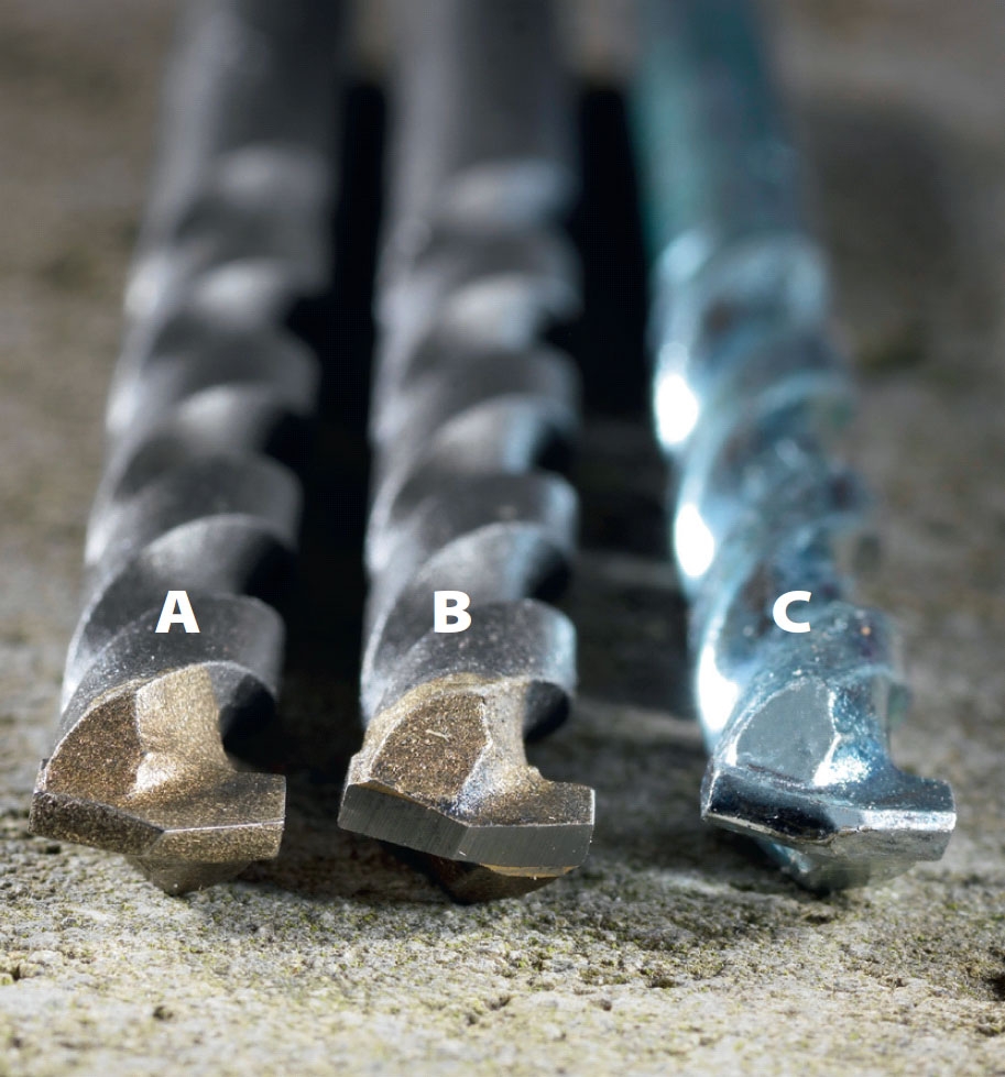 Borene ligner hinanden, men har forskellige egenskaber. A: Er boret, du skal bruge, hvis du skal bore i rigtig hård beton og granit. Dette bor duer kun, hvis du borer med slag, men så gnaver det sig også gennem næsten alt. Prisen er derefter (dvs. høj), så det kan betale sig at spare lidt på det. B: Er et universalbor med skarpslebet platte (spids), som kan klare det meste, også beton og klinker. C: Er det normale blanke murbor, som er udmærket til at bore i almindelige mursten med.