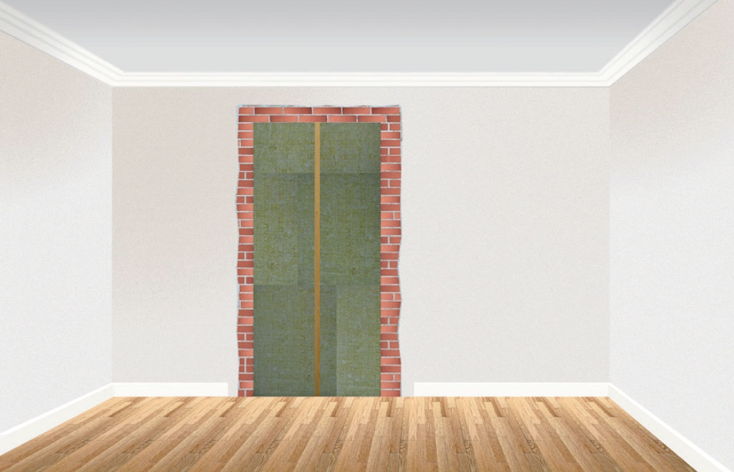 Når du har fjernet døren og karmen, skal du banke puds af væggen mindst 10 cm fra hullet. Du skal sætte en lodret stolpe i midten, da pladen ikke er stabil nok, hvis spændet er over 60 cm. Sav så en 15 mm fibergipsplade til, og lim den fast i hullet med montagelim. Den hæfter perfekt på murværk, binder hurtigt og hærder på et døgn.