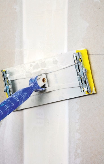 Når limen er hærdet, spartler og sliber du, så plade og væg går 100 % ud i et. Herefter kan du male, tapetsere, sætte filt op, eller hvad du nu har lyst til.