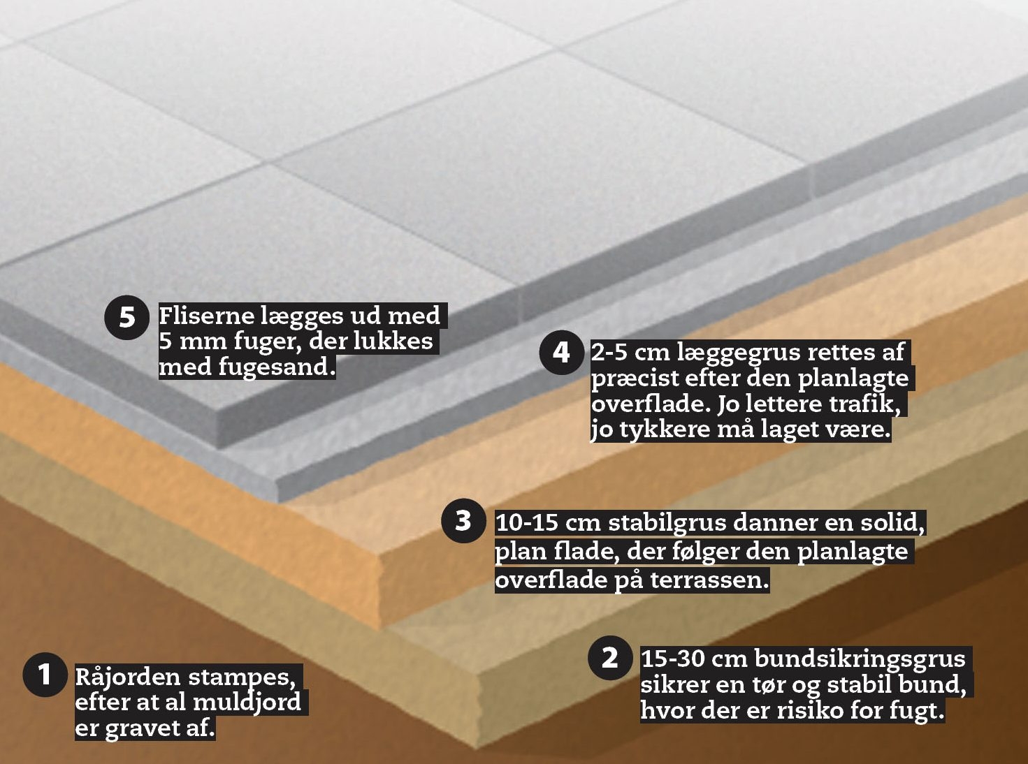 Afretningslaget rettes så præcist af, at sten eller fliser blot skal lægges på det og vibreres, så ligger de rigtigt. Til det bruger du to vandrør som ledere, når du trækker gruset plant med et langt lige bræt. Rørene graves ned i afretningsgruset, så overfladen ligger i præcis den rette dybde under den planlagte terrasses overflade, og så trækkes overskydende grus af med brættet, som du hele tiden holder nede på rørene.