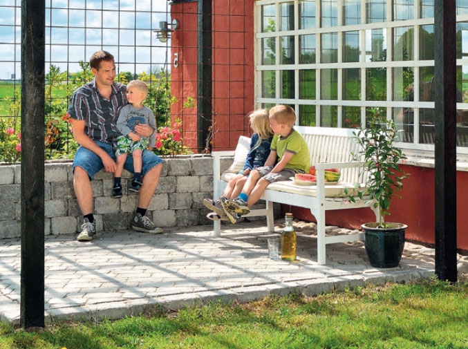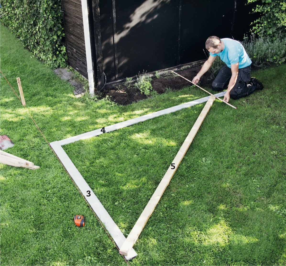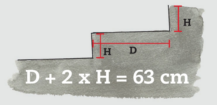 For at opnå en god gangrytme på trapperne bestemmer du trinenes dimensioner med trappeformlen: B + 2 x H = 63 cm - hvor B er bredden på trinet, og H er højden. De 63 cm svarer til et skridt, og formlen lader højden tælle dobbelt. Højden bør generelt ikke være over 18 cm, og i haven 4 vil den ofte være lav med brede trin. Husk at lave fald fremover, så vandet kan løbe af.