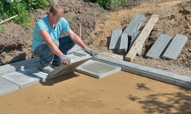 Når du lægger betonsten eller betonfliser, så tag fra flere paller samtidig, gerne fra mindst tre paller. Derved blandes stenene, og de farveforskelle, der kan være fra lag til lag og fra palle til palle, vil give et fint spil i belægningen. Blander man ikke, vil forskellene i stedet give felter med forskellige farver.