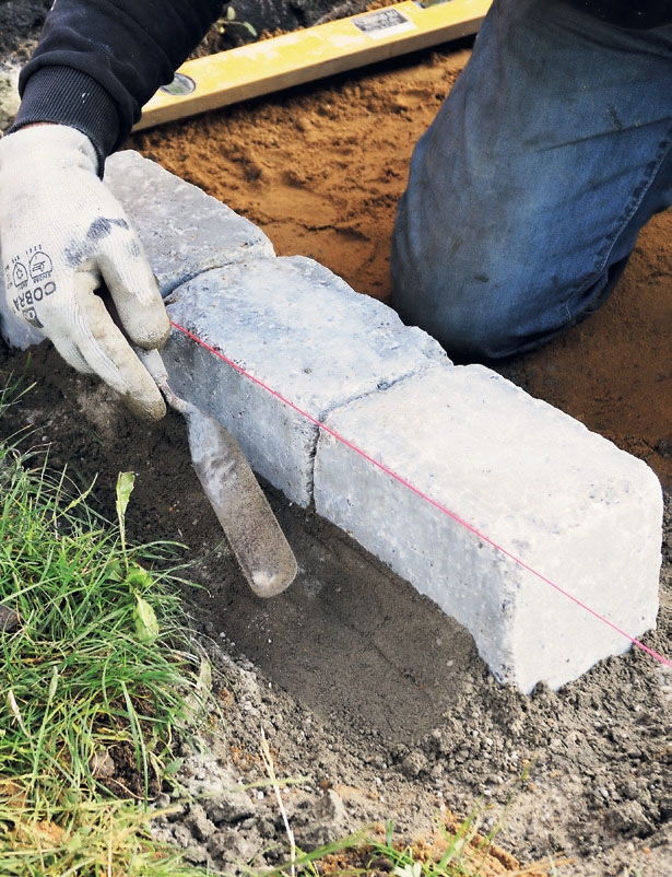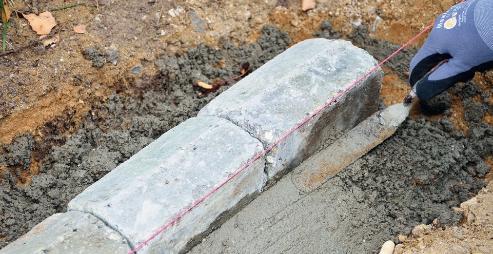 Ved at trække rettesnore ud fra dine pæle markerer du, både hvor din belægning skal ligge, og hvor højt den skal ligge. Pælene sætter du et pænt stykke ude, så de ikke kommer i karambolage med belægningen, og snorene sættes 2-3 mm over stenene, så de hele tiden holdes fri af stenene og ikke risikerer at blive skubbet ud af position.