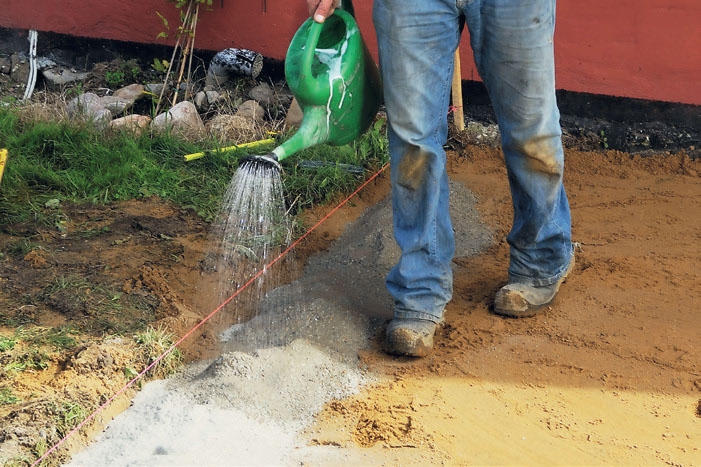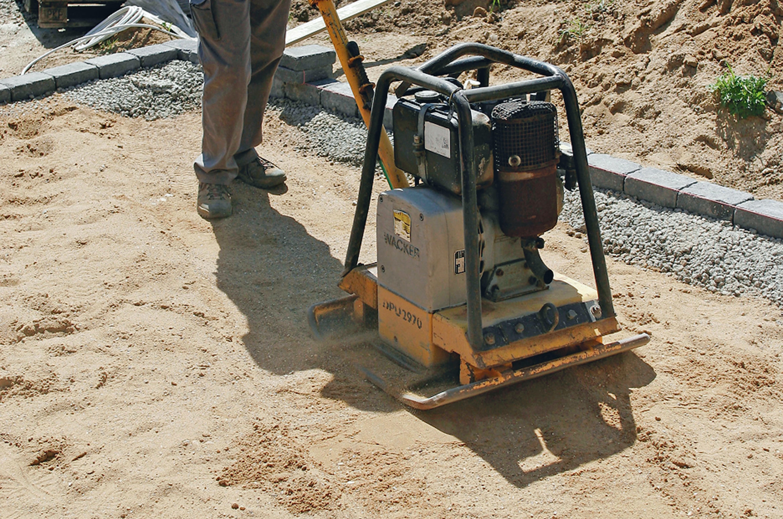 Når du stamper gruset, er det ofte en god idé at fugte det lidt med haveslangen. Så banker pladevibratoren det meget bedre sammen, da vandet smører kornene, så gruset pakker i stedet for bare at støve. Normalt er tre overkørsler med en 200 kg pladevibrator nok. Det bedste tegn på, at gruset er komprimeret optimalt, er, at pladevibratoren hopper.