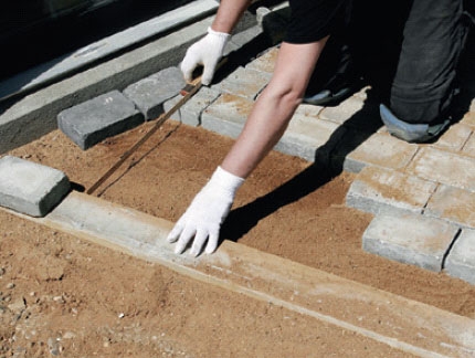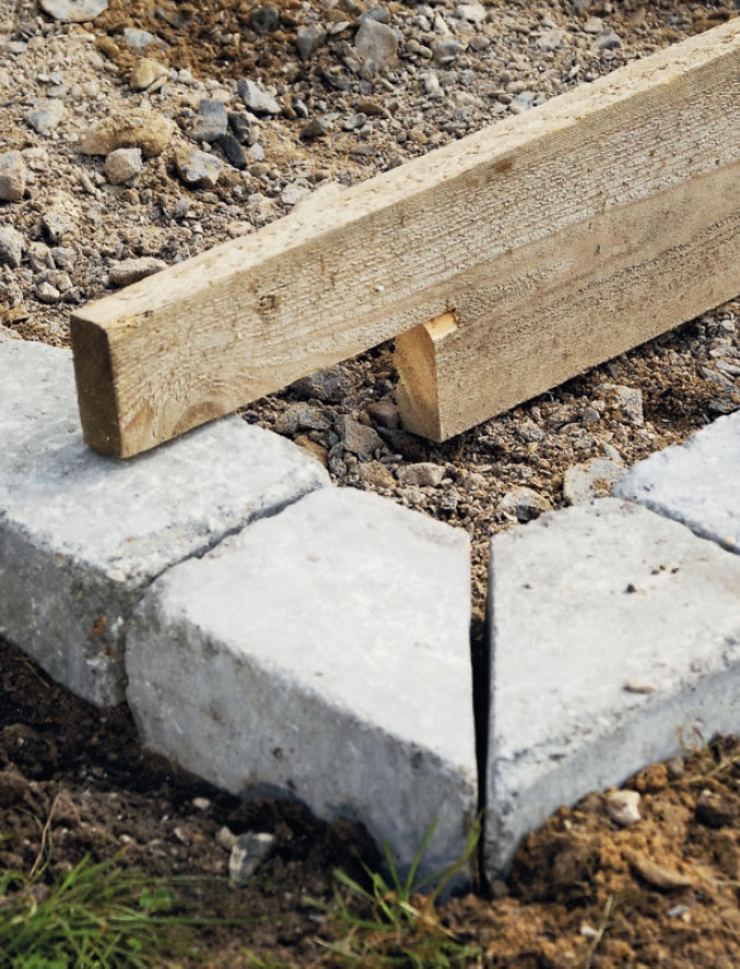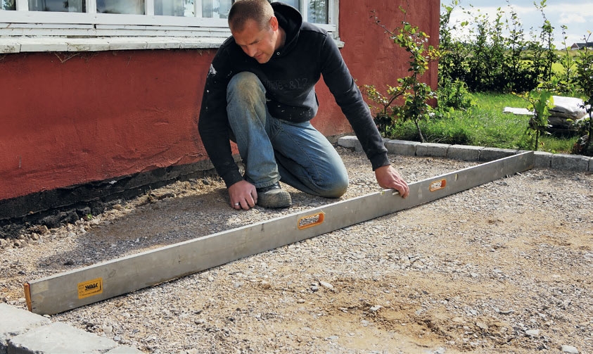 Har belægningen to parallelle sider med kantsikring af blokke, så kan du bruge dem som ledere, når gruset rettes af. Sav ud i enderne af et bræt, der rækker fra kant til kant, så er det hurtigt at rette stabilgrus og afretningslag af. Du kan bruge samme bræt til begge lag - søm blot klodser på i hakkene, når du kommer til afretningslaget.