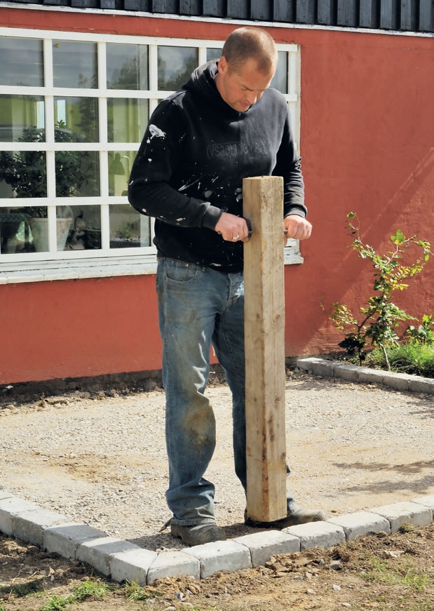 Sav et 1,2 meter langt stykke af en stolpe i målene 100 x 100 mm, bor et hul 20 cm fra den ene ende, sæt et gevindjern eller vandrør gennem hullet - og du har nu din egen brolæggerjomfru. Den er næsten uundværlig, når du 25 banker grus, sten og fliser på plads, hvor pladevibratoren ikke kan komme til.