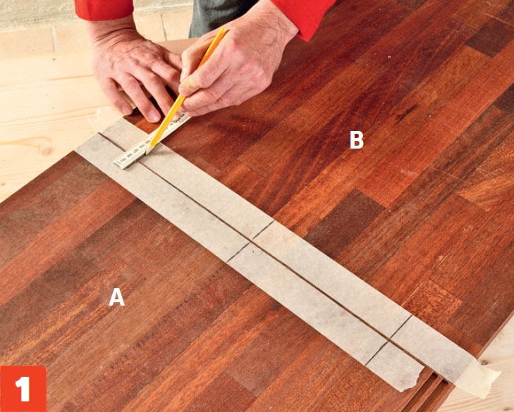 Læg bundpladen (A) og siderne (B) i flugt med hinanden, og streg op, hvor fladdyvler-ne skal placeres. Med lys tape på pladerne, ses blyantstregen tydeligt.
