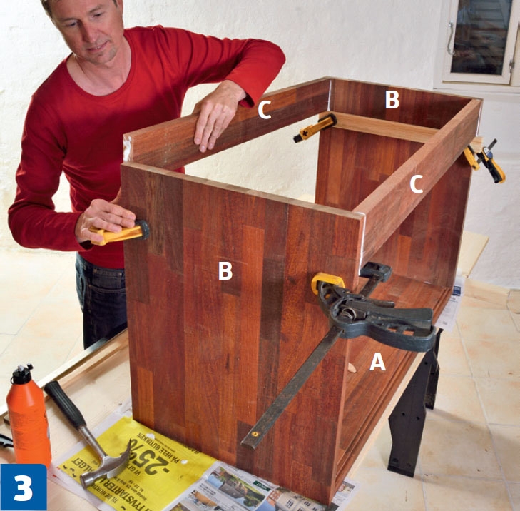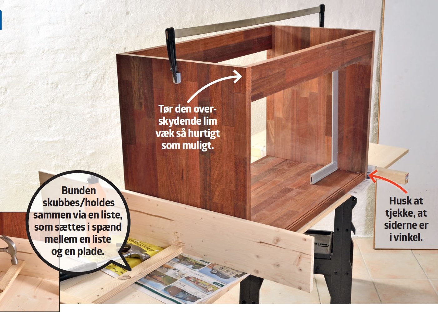 Skabet spændes sammen ved hjælp af en skruetvinge på toppen og en hjemmelavet opstilling i bunden. Sørg for, at delene er i vinkel, mens limen tørrer.