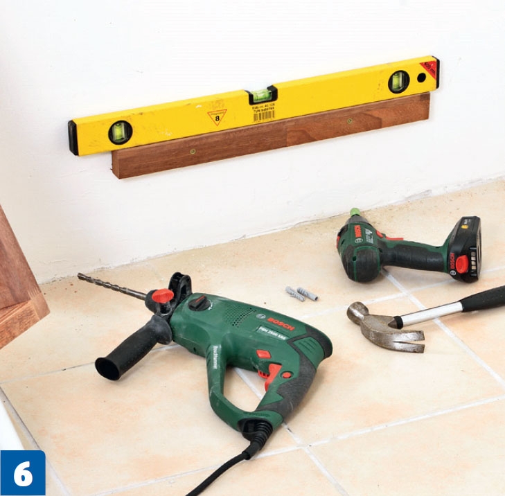 Herefter skrues en liste på væggen med skruer og rawlplugs der, hvor skabet skal støtte mod væggen.