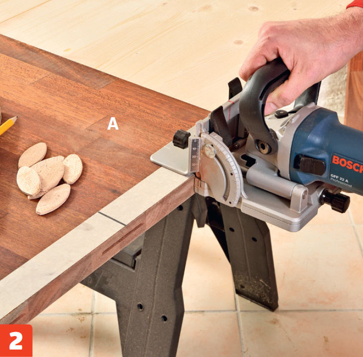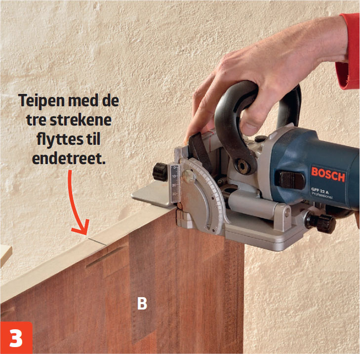 Begynd med udfræsningerne i begge ender af bundpladen (A). Hold lamelfræserens midtermarkering ud for mærkerne, og skub fræsedelen ind.