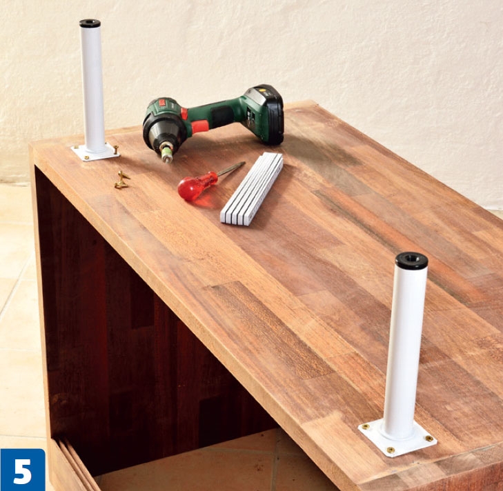 Når limen er tør, vender vi skabet om og skruer støttebenene fast med 4,0 x 20 mm skruer. Vi har valgt kun at sætte to ben forrest. På den måde bliver rengøringen under skabet meget lettere at gå til.