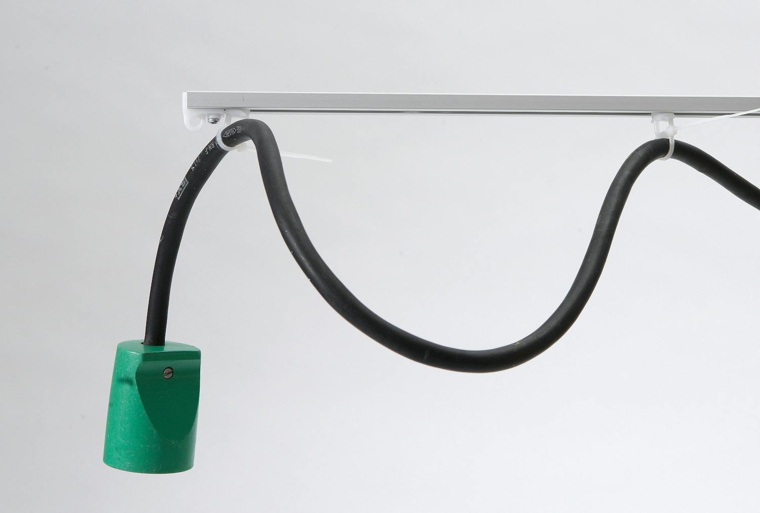 En nem løsning er en gardinskinne, der skrues op i loftet. En ledning kan sættes fast på en række af de små plastløbere med strips, sådan at ledningen hænger i buer mellem løberne. Så kan stikket for enden følge med et godt stykke hen over arbejdsområdet, imens der arbejdes.
