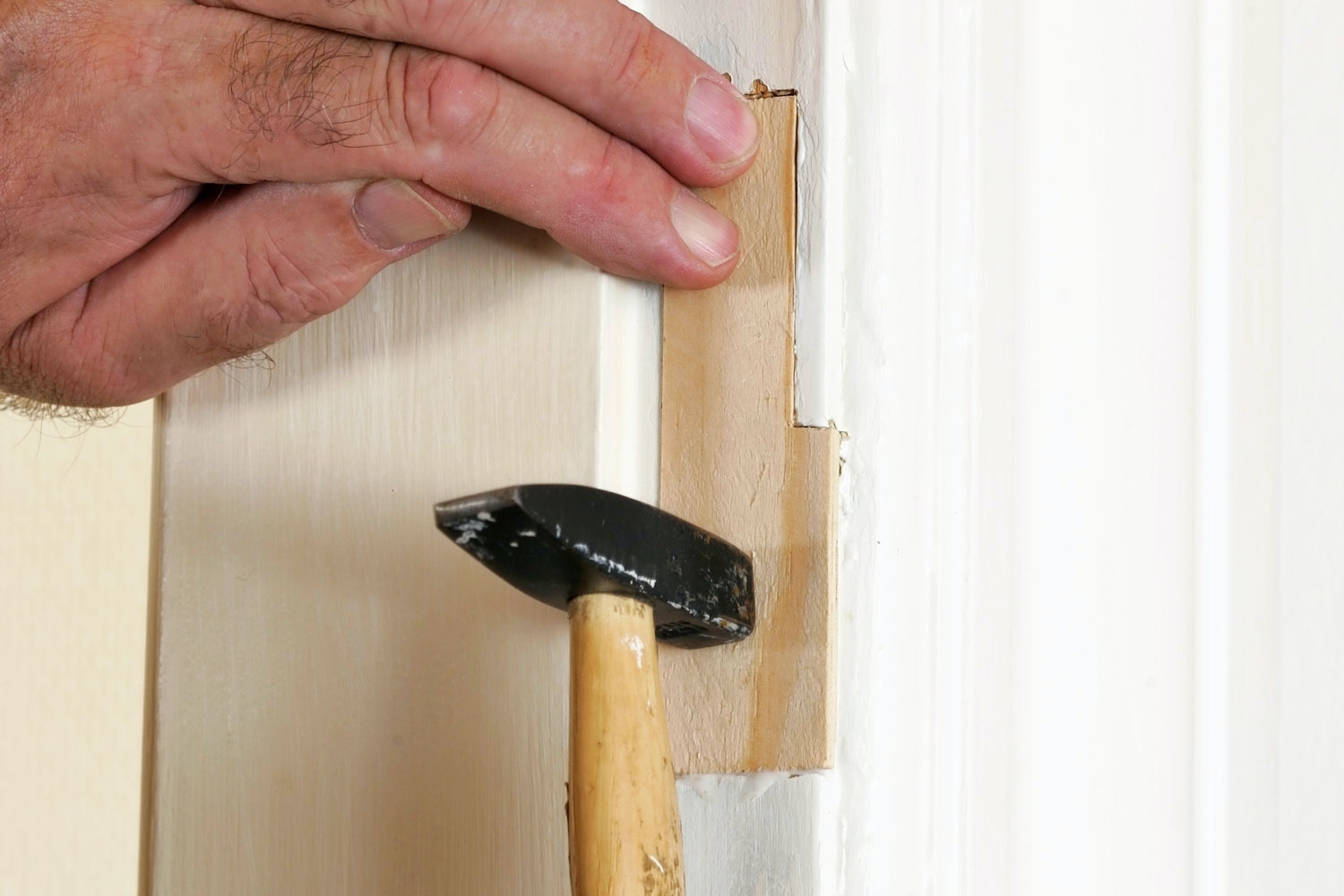 Når limen er tør, sliber du lusen plan med dørkarmen og maler den. Så har du en god og nem lappeløsning til karmen.