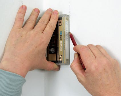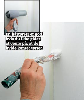 Mal først hjørnet hvidt, og marker så den bredde, kanten skal have. Når du maler, må den hvide farve gerne gå lidt ud over den anslåede kant. Tegn kanten op med en afstandklods fx et kassettebånd, som føres hele vejen ned langs hjørnet.