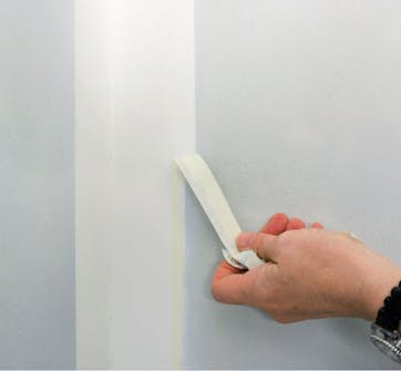 Mal med hvidt på ydersiden af tapen - altså den side, der senere ønskes blå. Formålet er at lade det maling, der kan komme ind gennem åbningerne i tapen, passere, men i den hvide farve. Det er denne fidus, der gør kanten skarp.