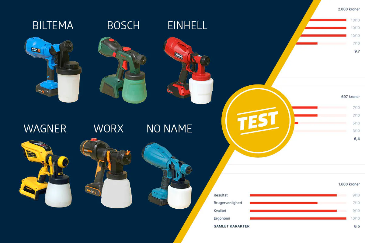Sprøjtepistolerne bliver testet og får karakterer i disse fire kategorier; resultat, brugervenlighed, kvalitet og ergonomi.