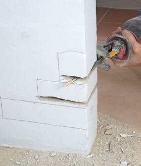 Med et velplaceret slag fra en murhammer kan stenene tilpasses. Det kræver lidt øvelse. Du kan snyde lidt ved at skære en rille med en vinkelsliber, før du svinger hammeren.