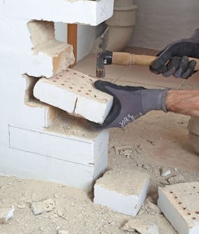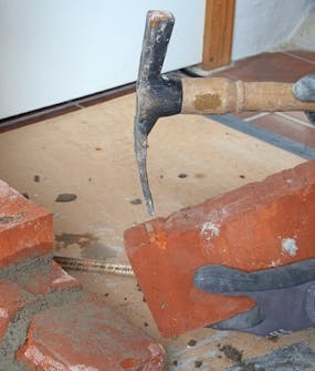 Stenene kan fjernes med hammer og mejsel, men det er nemmere og hurtigere at skære dem løs med en bajonetsav. Arbejder du udendørs, kan du i stedet bruge en vinkelsliber med diamantskæreskive. Det sviner bare voldsomt.