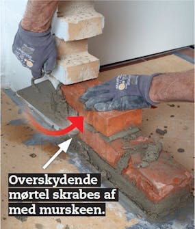 Fyld mørtel i alle de lodrette fuger og de steder, hvor du mangler at fylde mørtel i de vandrette fuger. Her skal du bruge en fugeske.