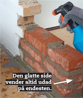 Det er en god idé at arbejde med våde mursten. Så hænger mørtlen bedre fast, og den tørrer ikke lige så hurtigt. Det betyder, at du har lidt længere tid til at arbejde stenene rigtigt på plads.