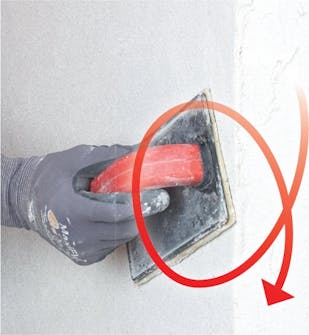 Det nye pudslag trækkes på med et stålbræt. Brættet holdes lidt på skrå, mens pudsen trykkes fast.