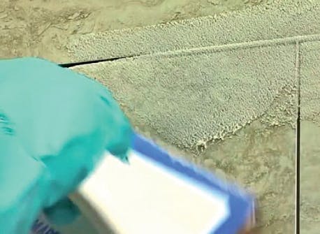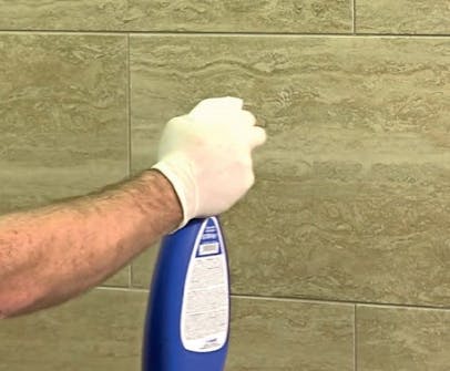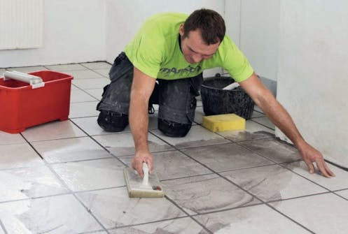 Gør flisesvampen våd, og træk overskydende vand af på spandens ruller, før du vasker fliserne over i cirkulære bevægelser.