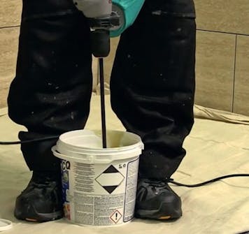 Rør massen sammen i 4-5 minutter med et piskeris på boremaskinen. Konsistensen er lidt tykkere end den cementbaserede fugemasse.