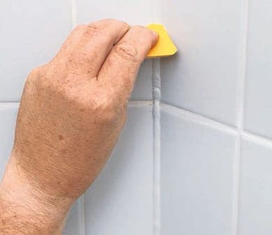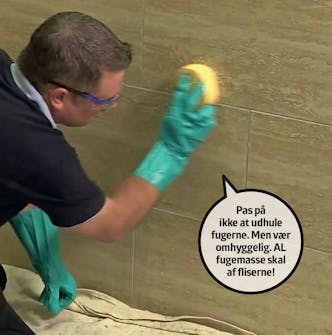 Træk fugemassen på med et fugebræt. Sørg for at få massen presset godt ned i alle fuger - vend og drej fugebrættet, som det passer. Træk overskydende fugemasse af fliserne med diagonale bevægelser, så der bliver så lidt som muligt, der skal vaskes af.