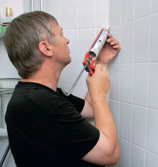 Fyld fugen med silikonemassen. Hullet i patronens tud skal være så bredt som fugen, ikke bredere. Fyld fugen op, så massen danner en lille bue over fugen. Når du lægger fugepistolen fra dig, så husk at udløse pistolen og lægge spidsen på et stykke papir, der fanger overskydende silikone.