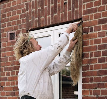 Stop isolering ind imellem vinduesramme og murværk. Du skal banke det hårdt sammen, fx med et sløvt stemmejern eller en tømmervinkel. Stop, indtil der er cirka 3 cm fra isoleringen til vinduesrammens forkant.