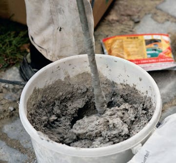 Bland kalkmørtlen op med vand, og tilsæt fæhårene eller plastf brene efter de anbefalede blandingsforhold. Mørtlen skal være så fast, at den netop kan hænge fast på fugeskeen.