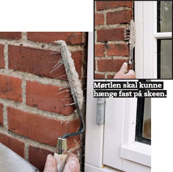 Fugerne skal laves af kalkmørtel uden cement. En god pudsemørtel hedder KKh 35/65/500, der indikerer blandingsforholdet mellem hydratkalk, hydraulisk kalk og sand. Det er en fleksibel mørtel, der kan optage de små bevægelser, der er mellem de to materialer: træet i vinduesrammen og murværket.
