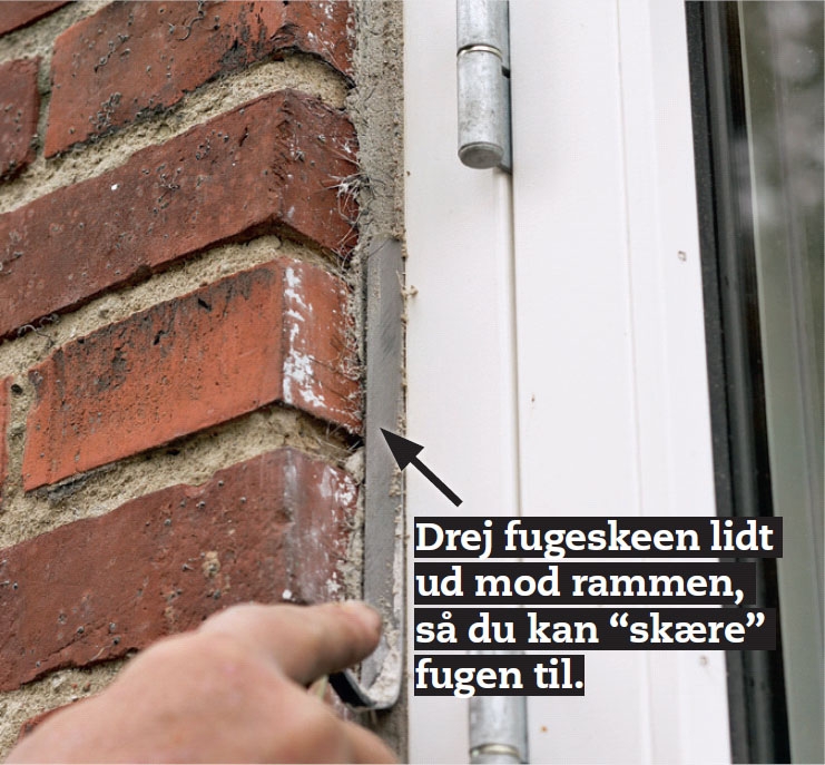 Når mørtlen har sat sig, det vil sige, når du kan trykke let på den, uden at den føles meget blød, lægger du andet lag fuge på efter samme mønster som første lag. Drej fugeskeen lidt, så du “skærer” fugen af langs vinduesrammen.