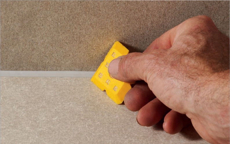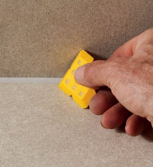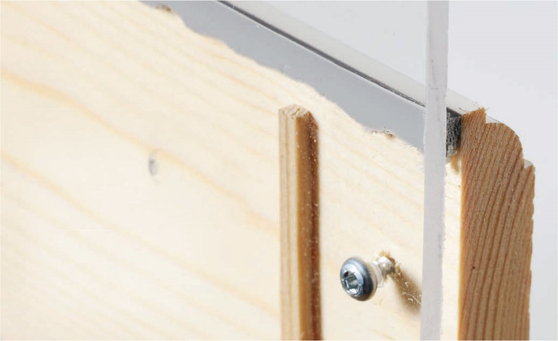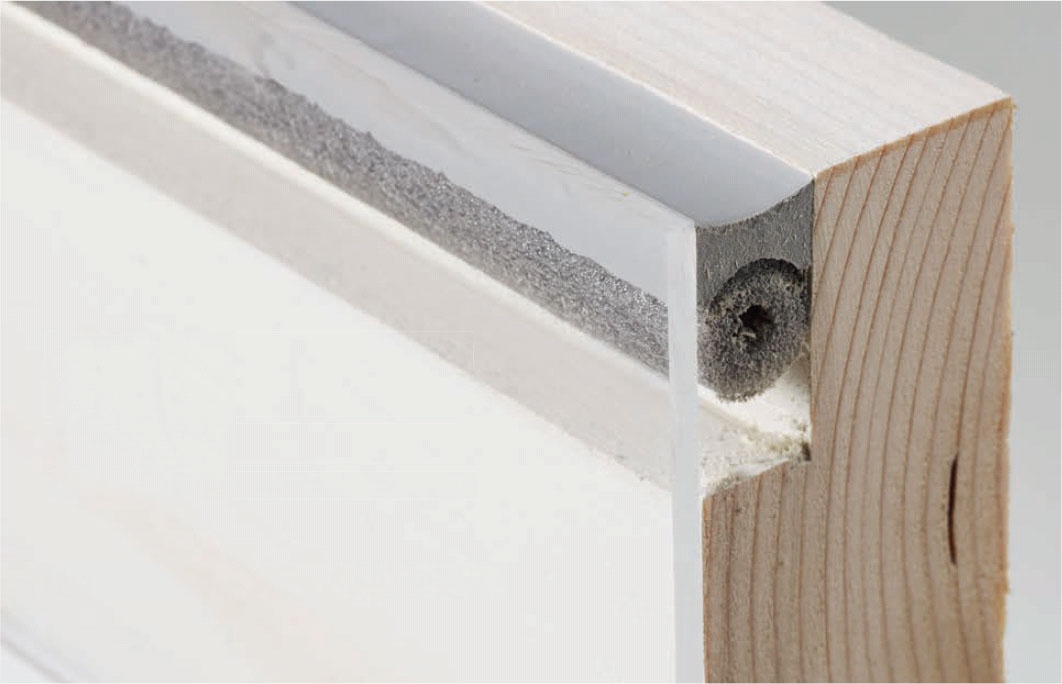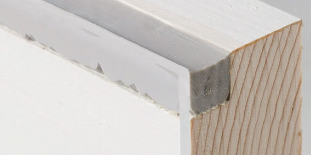 Den plastiske fuge fylder sprækken helt ud. Skabelonen her består af en lægte med en not. Den ene side er bygget af plexiglas, så det er muligt at se, hvordan fugen ligger.