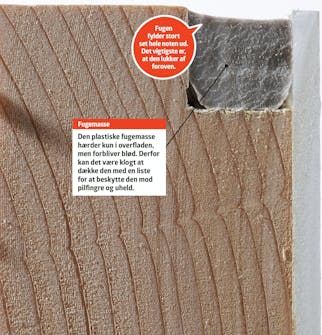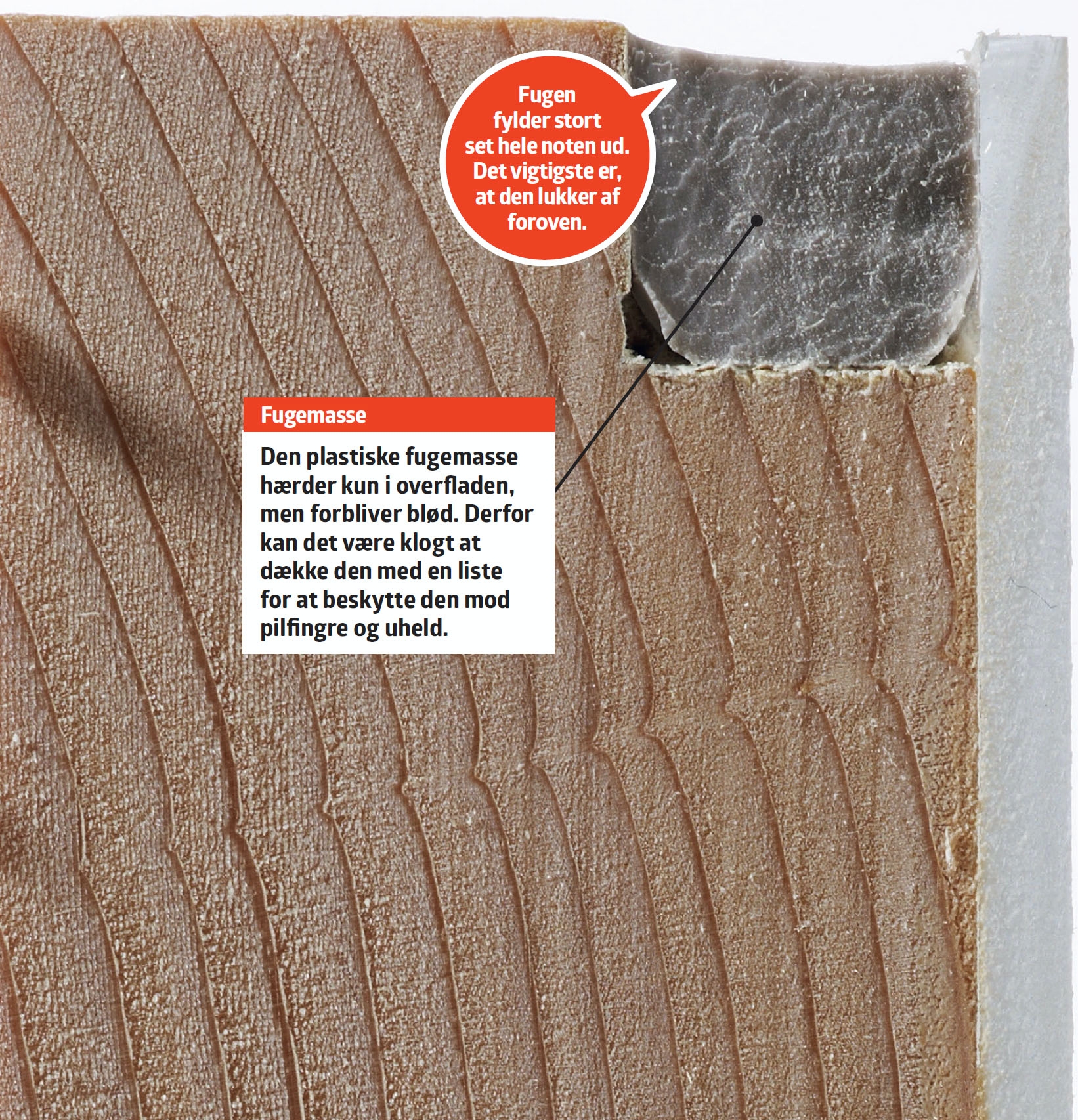 Den plastiske fugemasse skydes godt ned i hullet, så det bliver fyldt helt ud. Der må ikke være huller - fugen skal lukke helt af.