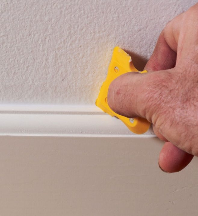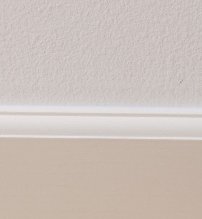 Vi har sat lidt afstandsstykker ind i vores skabelon for at opnå samme effekt som på en lidt ujævn væg. Fugemassen løber lidt ned bag fodpanelet og fylder sprækken ud.