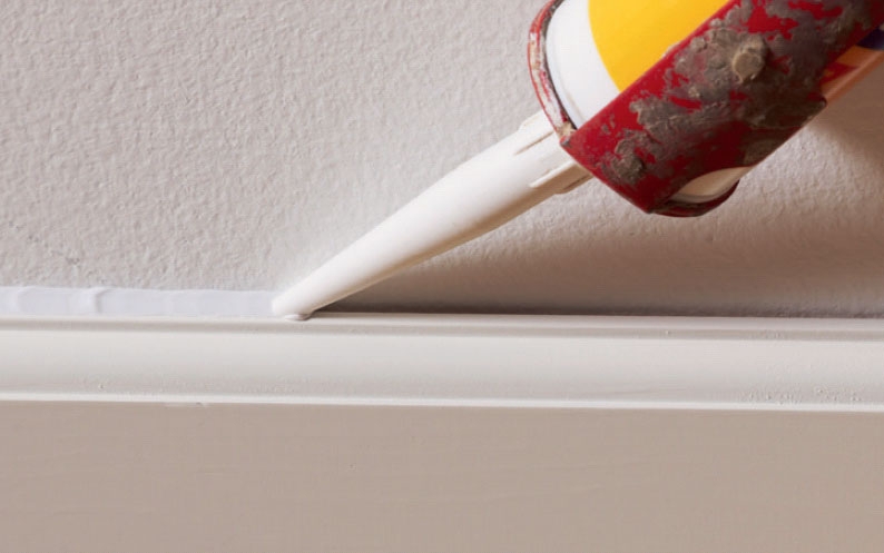 Læg fugen oven på det rengjorte fodpanel. Åbningen i tuden skal være ret lille, for fugen skal være ganske smal.