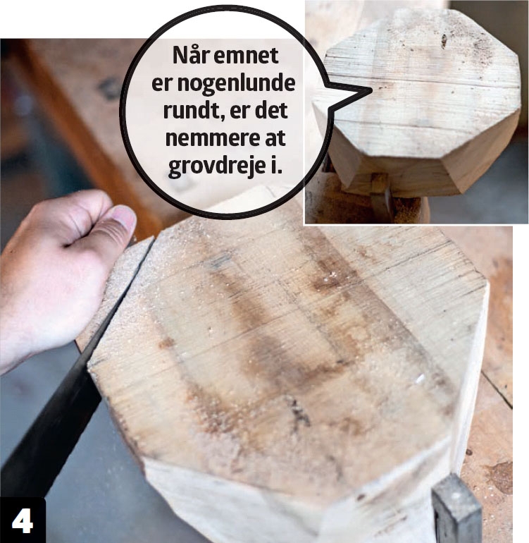 Skær hjørnerne af med en hånd- eller bajonetsav. Det gør, at du ikke skal bruge tid og kræfter på at dreje dem af, når emnet sidder i drejebænken. Et balanceret emne er både nemt og behageligt at arbejde med.